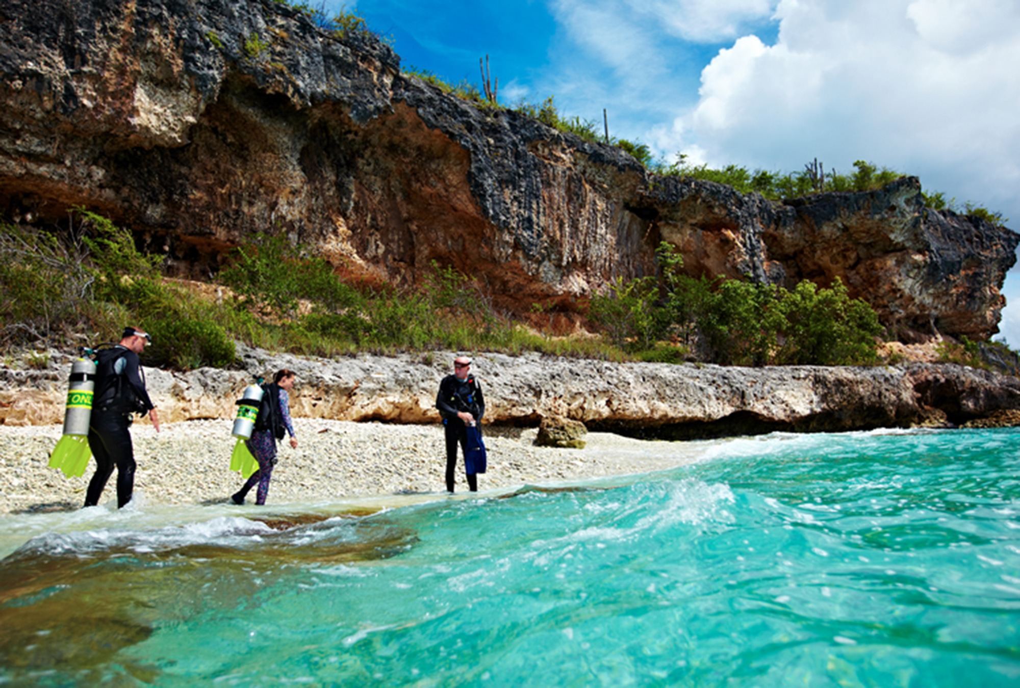 Stones marked with the names of dive sites can be seen from the coastal roads and a ‘two minutes’ swim (literally) will reveal a reef teeming with marine life. Drive-through dive stations allow divers to refill their tanks before heading out to other alluring spots.