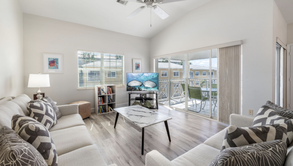 Welcome to Regal Beach Club 623, this second floor 2-bedroom / 2-bathroom condo is grand and elegant and is the perfect place to relax and enjoy the Cayman Islands. The master bedroom is modern with costal sea foam green décor and has a king bed, a flat screen TV and an ensuite bathroom.